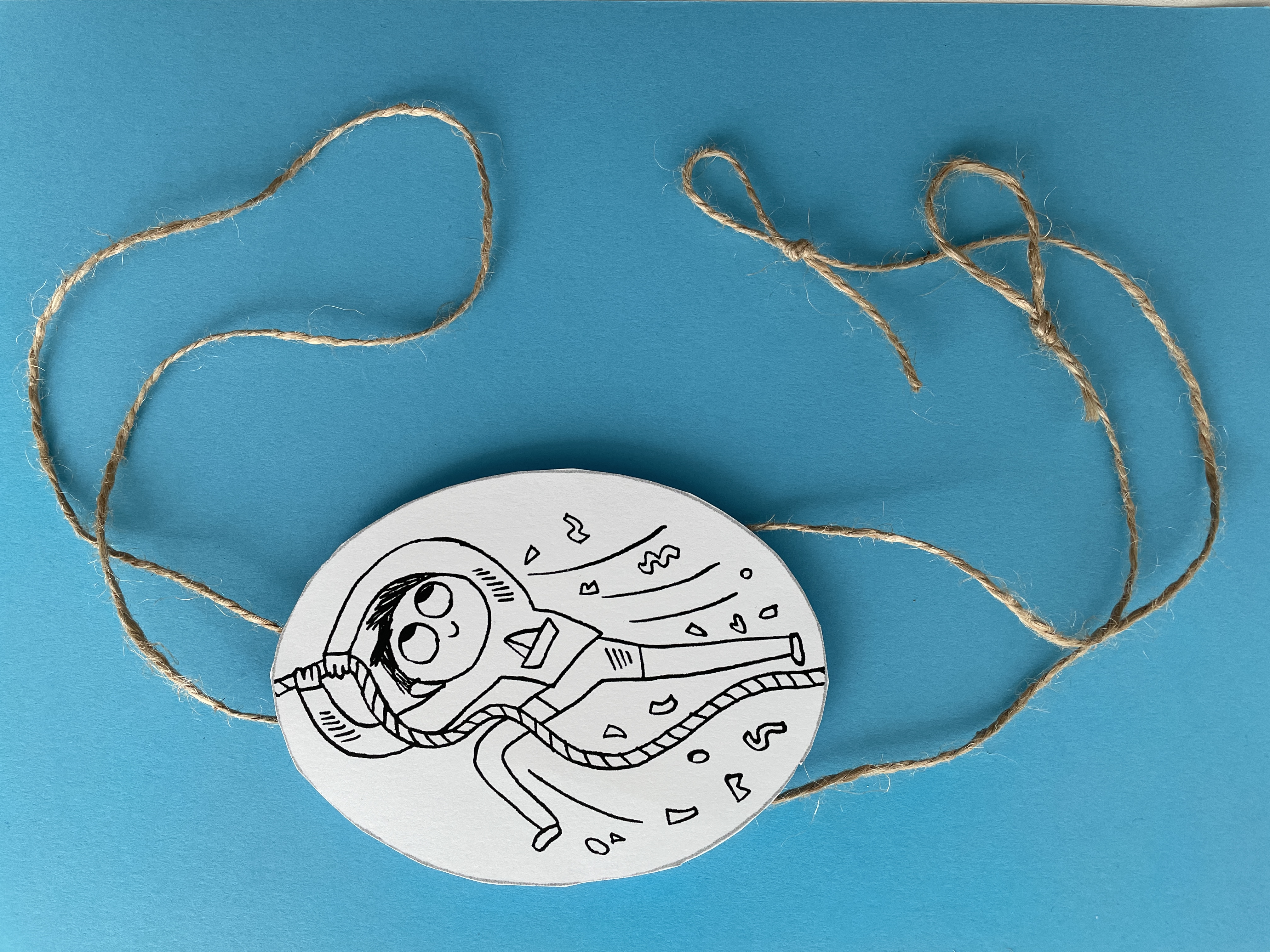 Postup: Z papíru vystřihněte tvar svého lezouna (může to být ovál, na který nakreslíte libovolný obrázek, ale klidně to může být třeba tvar rakety nebo letadla či broučka apod.). Na jednu stranu namalujte svůj obrázek a na druhou přilepte izolepou šikmo dva kousky ustřiženého brčka, tak jak je vidět na fotografii. Skrz brčka provlékněte provázek, ohyb provázku je na straně, kde jsou konce brček blíž u sebe, volné konce provázku jsou na straně, kde jsou konce brček dál od sebe. Ohyb provázku zahákněte třeba za kličku u okna, navlékněte ji na nohu od židle nebo jen přes držadlo vařečky – záleží na tom, kam chcete svého lezouna nechat vyšplhat. Lezouna posuňte k volným koncům provázku a tyto konce pevně chyťte do ruky. Za volné konce provázku střídavě tahejte do stran – lezoun se bude díky tření mezi brčky a provázkem posouvat pryč od vás. Aby se s lezounem lépe pracovalo menším dětem a aby provázek nevyklouzával z brček, můžete na koncích provázku udělat smyčky nebo na ně navázat korálky.