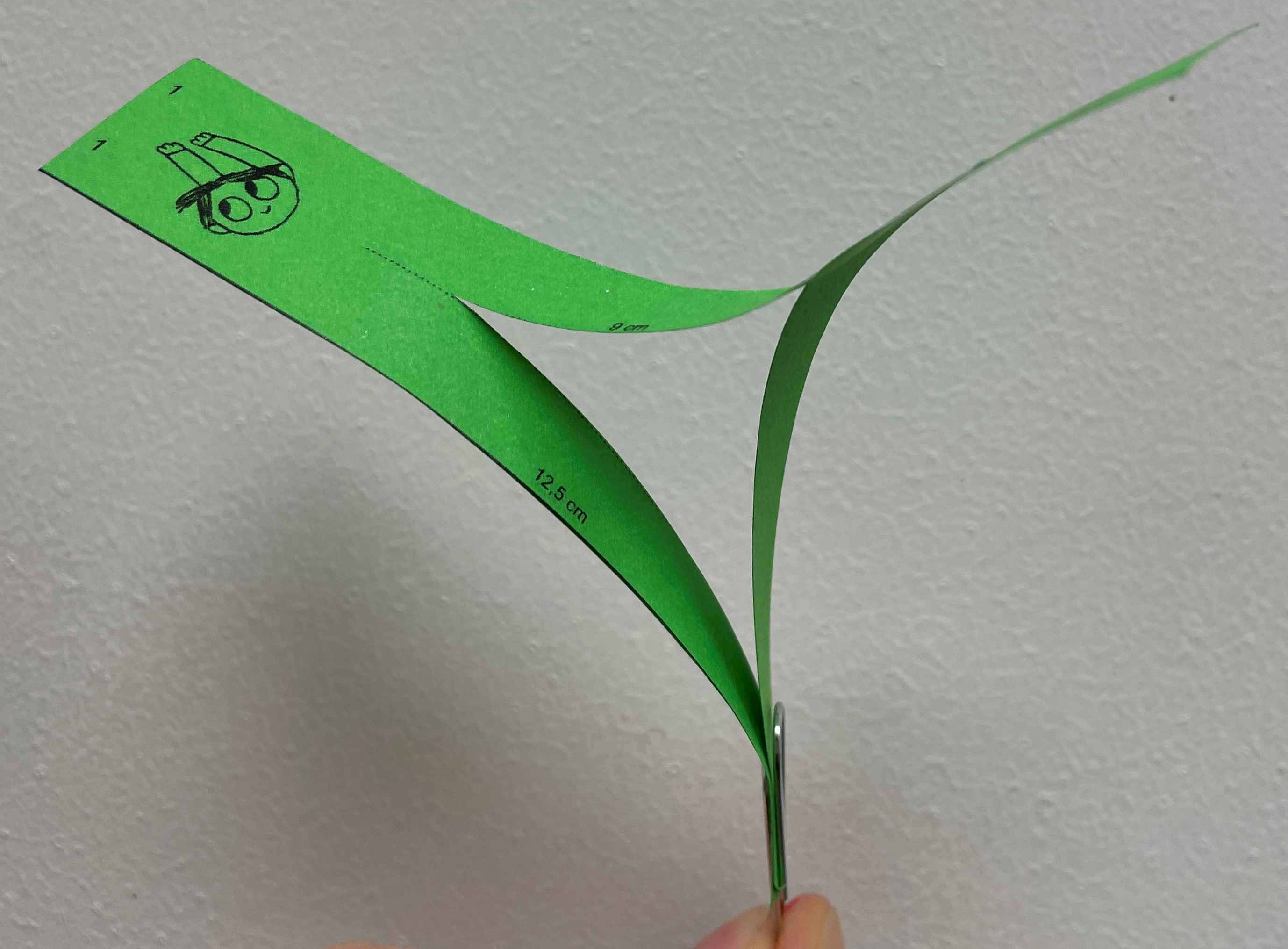 Postup: Z papíru vystřihněte obdélník o stranách 3 cm a 12,5 cm. Podélně na něm vyznačte tři stejně široké proužky a z opačných stran vždy jeden z nich 9 cm od kraje nastřihněte, jak je naznačeno na obrázku. Volné konce přiložte k sobě a spojte kancelářskou sponkou, aby vznikl prohnutý trojúhelník. Vírníček chyťte za kancelářskou sponku, pusťte ho z co největší výšky a sledujte jeho pomalý let k zemi.