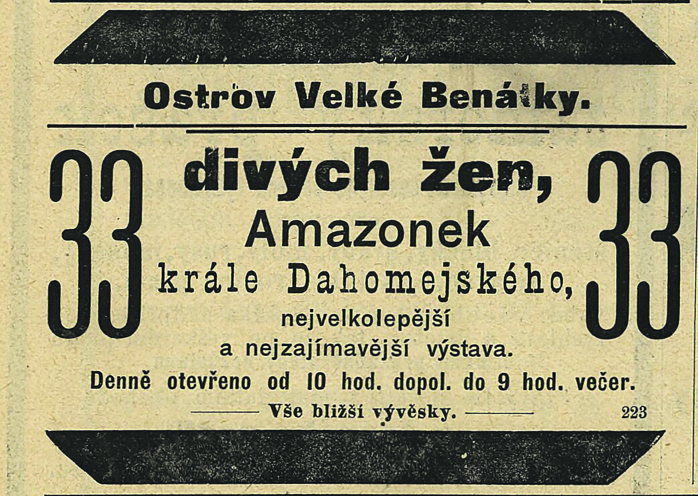 Z dnešního pohledu poněkud bizarní podívaná – pozvánka z roku 1888 na návštěvu osady Dahomejek, domorodých žen ze západní Afriky, z území dnešního Beninu.