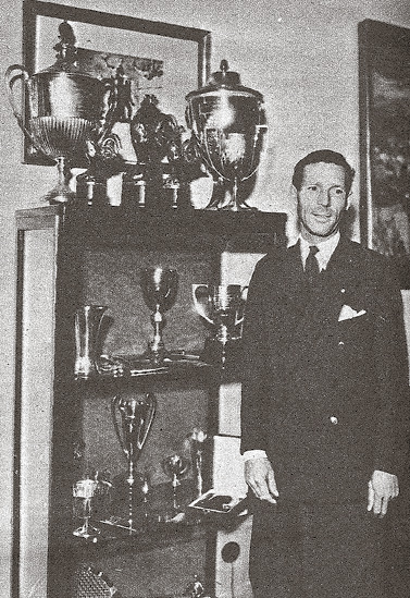 Tenista Karel Koželuh a jeho trofeje během oslav 50. narozenin v roce 1945