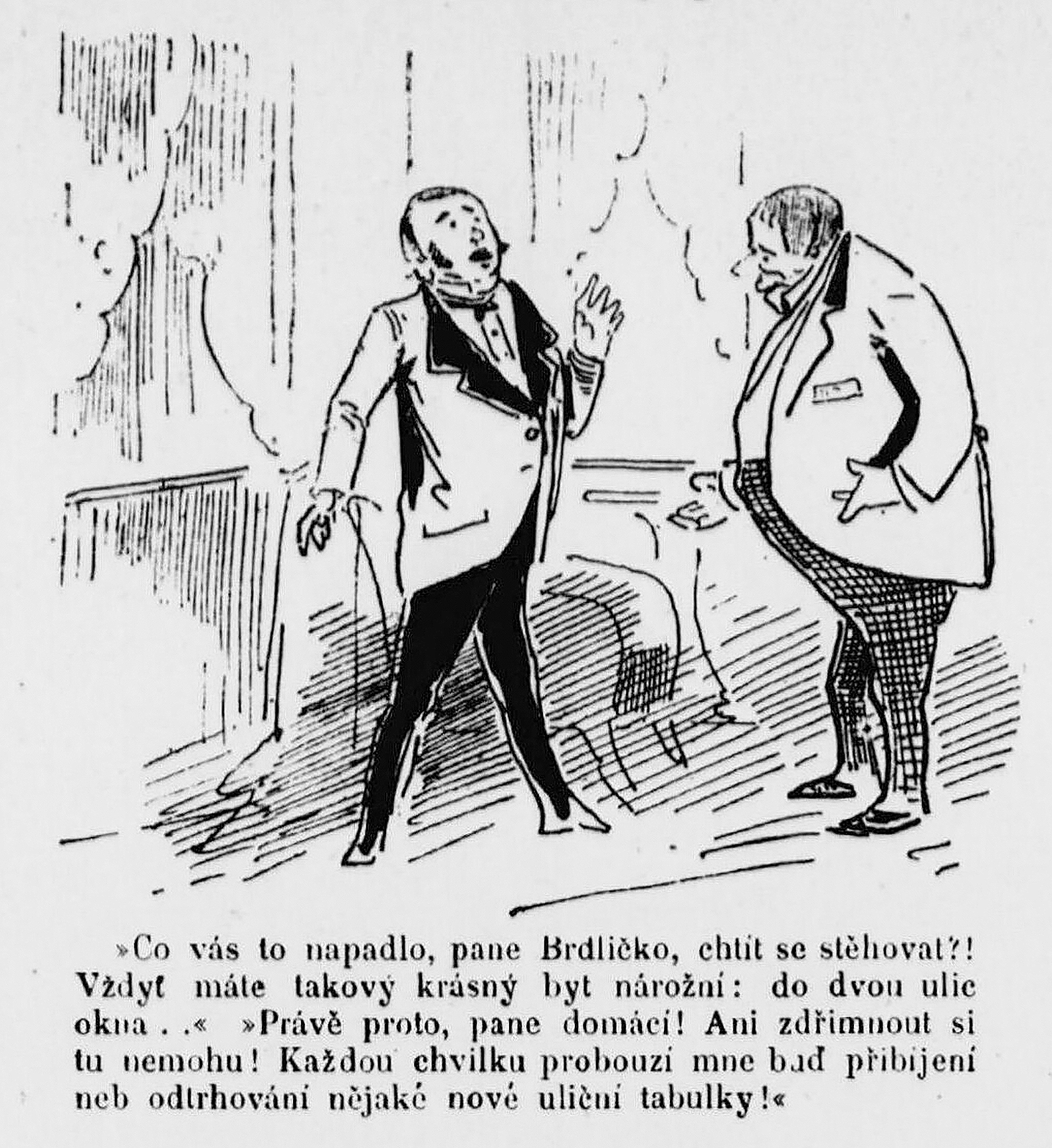 Kreslený vtip z Humoristických listů z roku 1894 si dělá legraci z tehdejší kauzy – plamenných diskuzí, zda má být text na uličních tabulkách pouze česky, nebo i německy