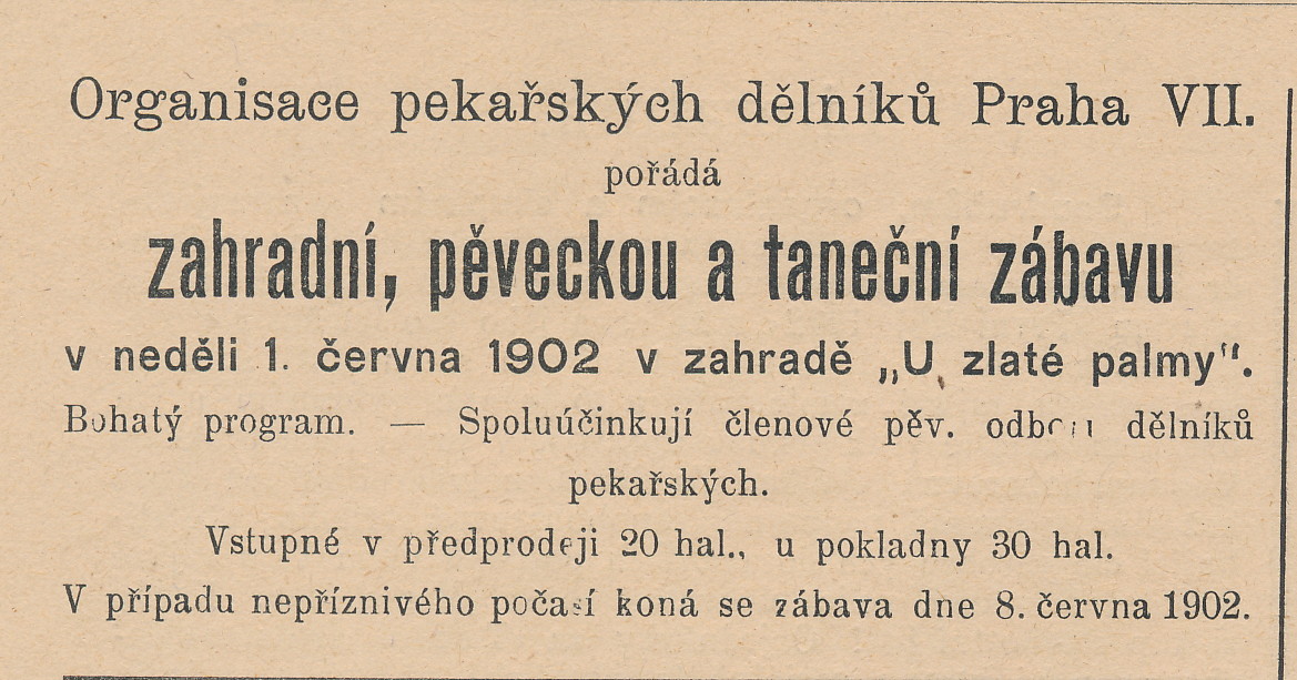 Dělnické spolky často pořádaly nejrůznější zábavy, které přinášely vítané příjmy do spolkových pokladen. Oblíbeným místem konání těchto akcí byl restaurant U Zlaté palmy, který se nacházel v domě č. p. 393 na rohu dnešních ulic Milady Horákové a Haškova.
