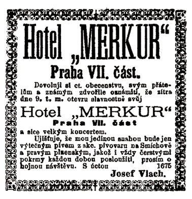 I druhý hotel na tehdejší Belcrediho třídě vznikl už v osmdesátých letech 19. století. Na počátku listopadu 1887 oznamoval Josef Vlach, že se 9. listopadu chystá v domě č. p. 534 slavnostně otevřít hotel s názvem Merkur. Potenciální návštěvníky ujistil, že jeho jedinou snahou bude jen výtečným pivem z akciového pivovaru na Smíchově a pravým plzeňským, jakož i vždy čerstvými pokrmy každou dobou posloužiti“. Na začátku devadesátých let si hoteliér Vlach zařídil „vedlejšák“ – v hotelu prodával tehdy populární a hojně používané keramické džbánky a tácky pod ně ze stejného materiálu. Ještě v první polovině devadesátých let se provozovatel podniku změnil – Vlacha vystřídal Lukáš Přech. Ten se rozhodl vsadit na pivo z pivovaru knížete ze Schwarzenberga v Protivíně. Stejně jako v jiných podobných podnicích i k hotelu Merkur patřil prostorný sál, ve kterém se pravidelně konaly koncerty a zejména taneční zábavy. Oblíbené bývaly i taneční kurzy pro veřejnost pod vedením vyhlášených tanečních mistrů. Na přelomu století je v sále Merkuru pořádal „tancmajstr“ Jan Šimůnek.