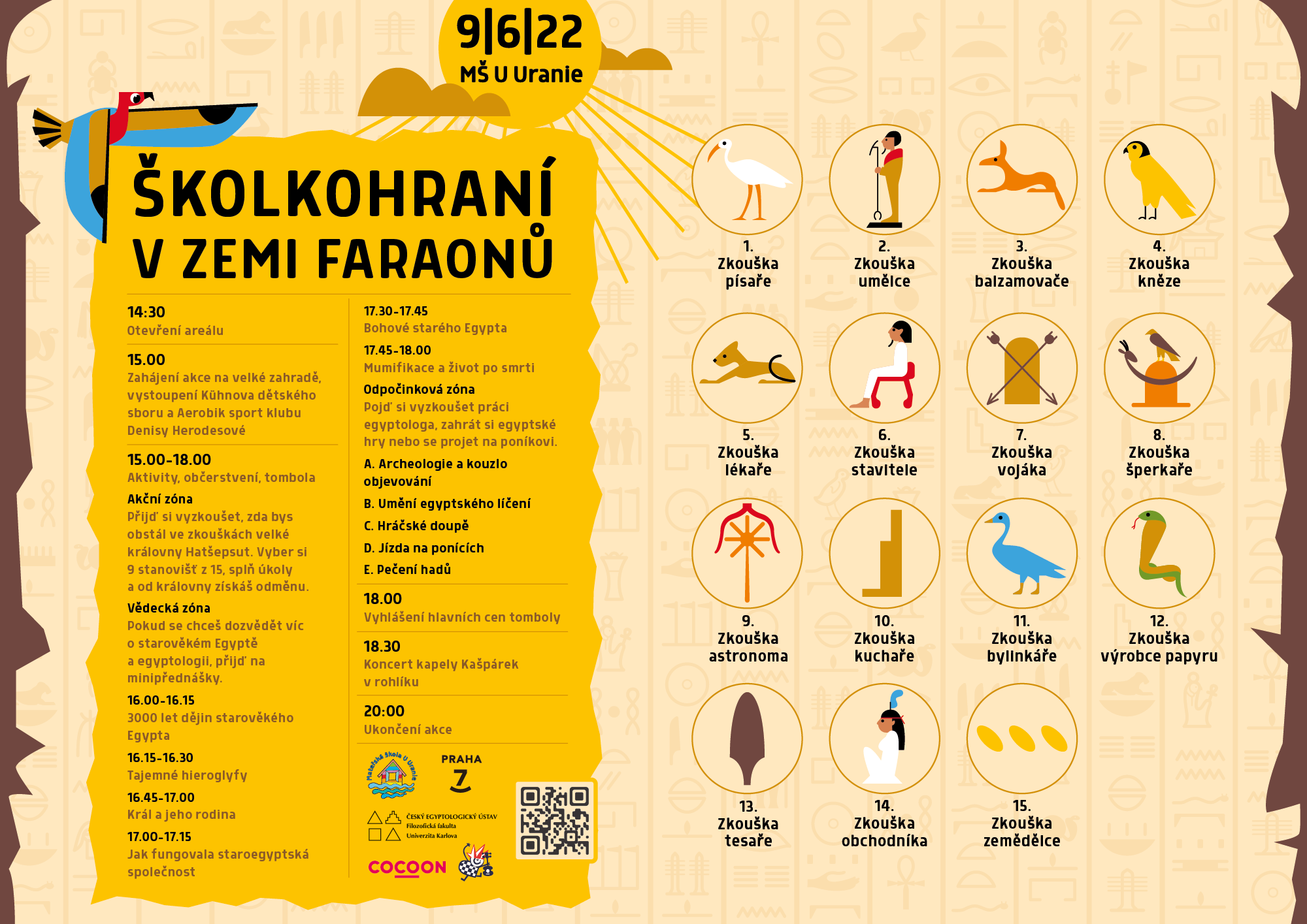 Čeká vás zábavná hra s 15 rozmanitými stanovišti, kde se dozvíte spoustu informací o životě starých Egypťanů a vyzkoušíte si jejich každodenní činnosti a řemesla. Za vaši pilnou snahu vás odmění samotná královna Hatšepsut, která bude dohlížet na vaše počínání.