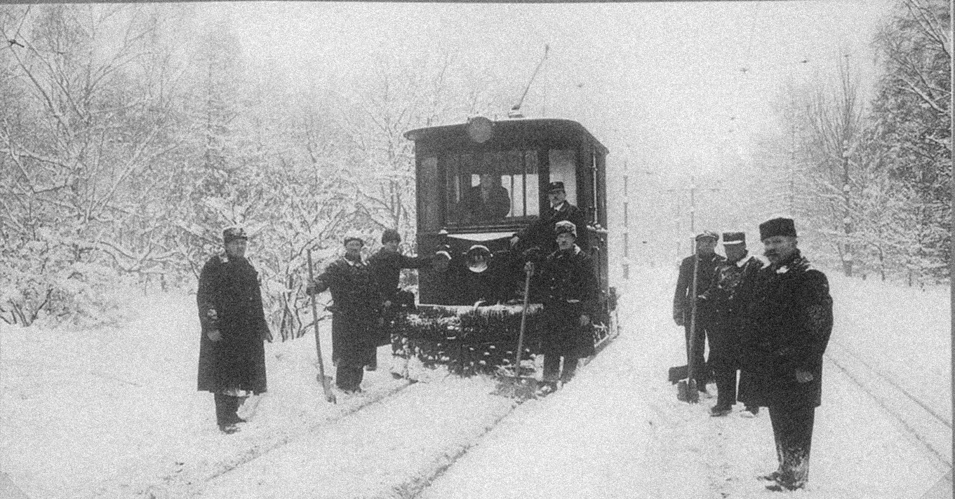 Tramvajový vůz s hrablem odklízející sníh ve Stromovce v zimě 1901