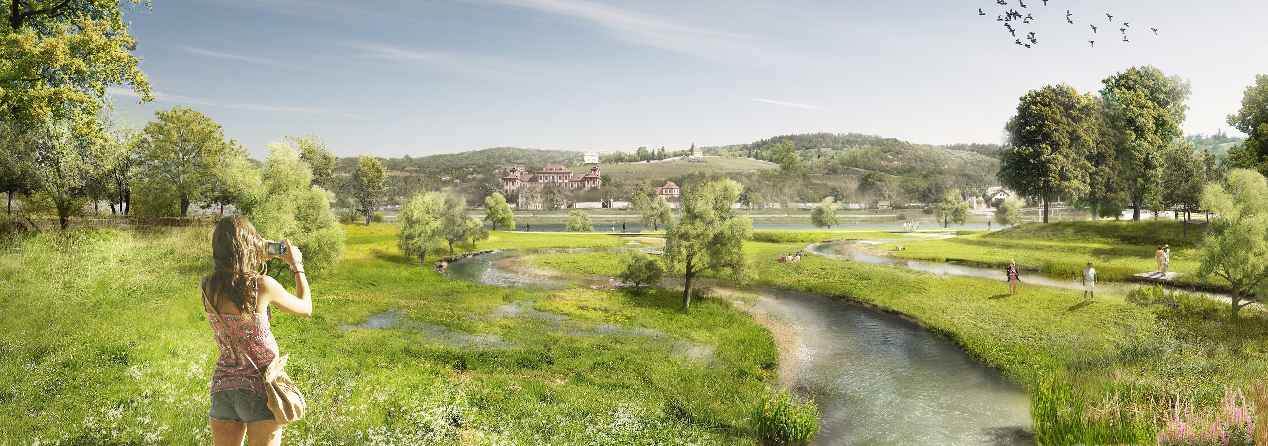 Vizualizace – pohled na vyústění průlehu a revitalizaci koryta Vltavy