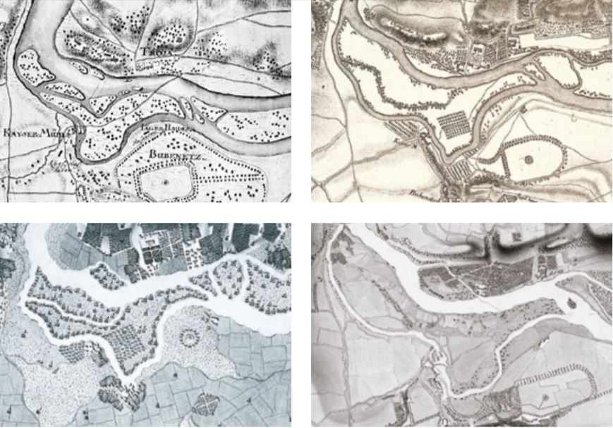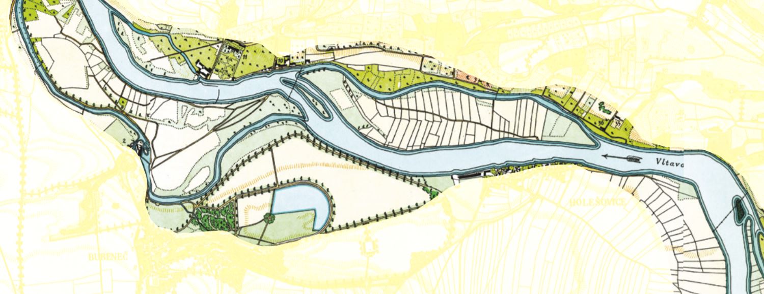 Dobové plány zachycují proměnu říčního koryta od poloviny 18.do poloviny 19.století. Živelné vznikání a mizení štěrkových ostrůvků v době záplav odedávna doprovázely lidské zásahy —stavění jezů a náhonů, zpevňování břehů i ostrovů.