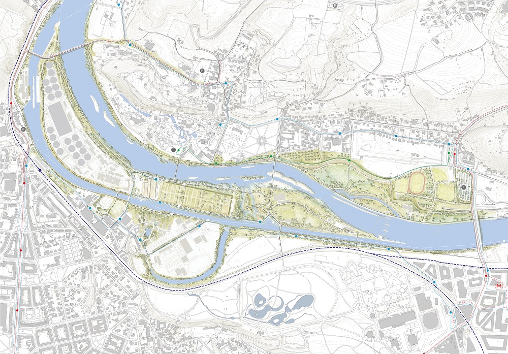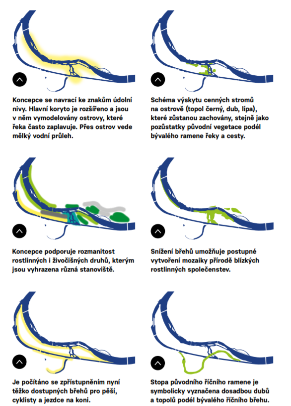Navržené úpravy projektu Nové vodní linky kladou důraz na vztah k řece a ctí terén nivy, čímž zachovávají paměť místa a napojují se na vitalitu říčního ekosystému. Revitalizace okolí čistírny zahrnuje mělký průleh napříč ostrovem a rozšíření severního ramena. Vznikne tak více prostoru nejen pro průtok velké vody, ale i biotopy na přechodu mezi řekou a břehy.