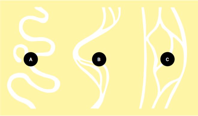 Řeka se chová v zásadě trojím způsobem: meandruje, (A) větví se, (C) nebo se zahlubuje. Záleží na tom, jestli teče z hor nebo nížinou, na jak tvrdé podloží při své cestě narazí a jak často a silně v průběhu roku prší. Podoba říčního koryta může také odrážet působení více procesů najednou. (B)
