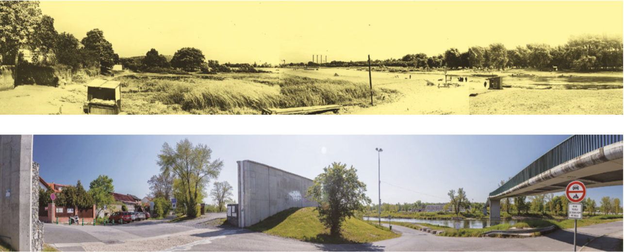 Novodobé protipovodňové úpravy se dotkly také lokality u Trojské lávky, jak můžeme vidět na panoramatických snímcích pořízených ze stejného místa s odstupem téměř sta let.