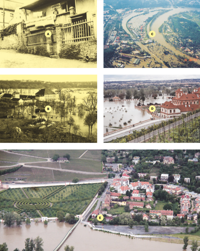Součástí života Trojské kotliny byla odedávna také velká voda. Starousedlické domy tomu byly přizpůsobené — v přízemí se nacházely dílny nebo obchody, bydlelo se v patře s pavlačí. (A) V obležení vody lidé mnohdy strávili i několik dní, jako například v březnu 1940 obyvatelé Trojského mlýna. (B) Technické úpravy toků v povodí Vltavy přispívají k rychlému odtoku vody z krajiny, což může vést k ničivým záplavám. Při povodni v roce 2002 zmizel pod hladinou celý Císařský ostrov, (C) voda zalila i zahrady Trojského zámku. (D) Hráze sice chrání majetek, s každou další se však zároveň zmenšuje místo pro průtok vody během povodní. (E)