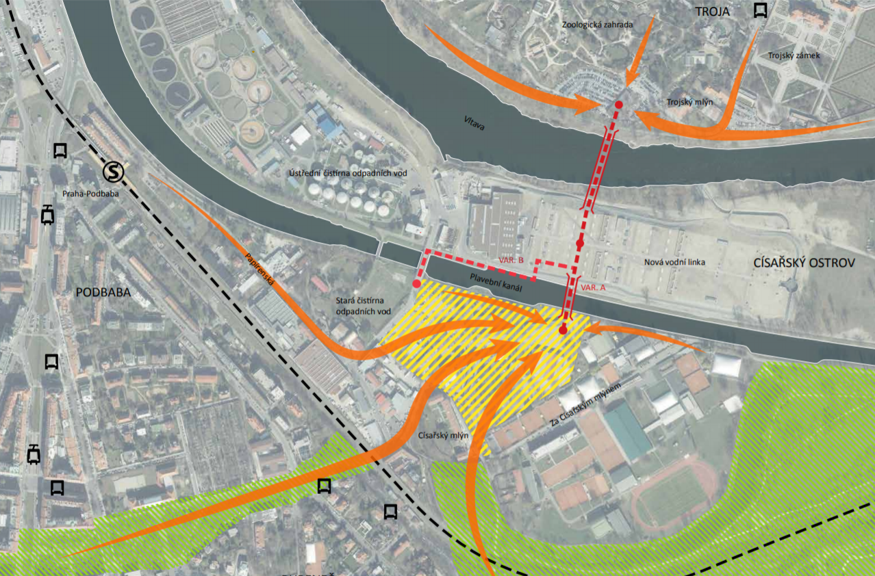 Koncepční studie prověřuje různé možnosti nového pěšího a cyklistického propojení přes Vltavu z Bubenče do Troji, které doplní systém pěších cest v rámci Trojské kotliny. Lávka přinese významné zkrácení vzdáleností především pro obyvatele Dejvic, Podbaby, Bubenče, Troji. Nabídne alternativu k dopravně přetížené pravobřežní cyklostezce nebo nové vycházkové okruhy návštěvníkům Stromovky i celé Trojské kotliny. Na pravém břehu bude lávka komfortně napojena na nábřežní cyklostezku i předpolí jižního vstupu do ZOO. Oblast kolem bývalých bubenečských papíren na levém břehu projde zásadní proměnou na obytnou čtvrť doplněnou o některé nebytové funkce. Stejně tak se počítá s aktivním zapojením historického areálu staré čistírny odpadních vod s dochovalým mostem bývalé polní drážky přes plavební kanál. Území bude veřejně prostupné a nabídne nové přístupy od města k nábřeží a Císařskému ostrovu. Zcela ojedinělým nově přístupným prostorem bude zelená střecha nové vodní linky.