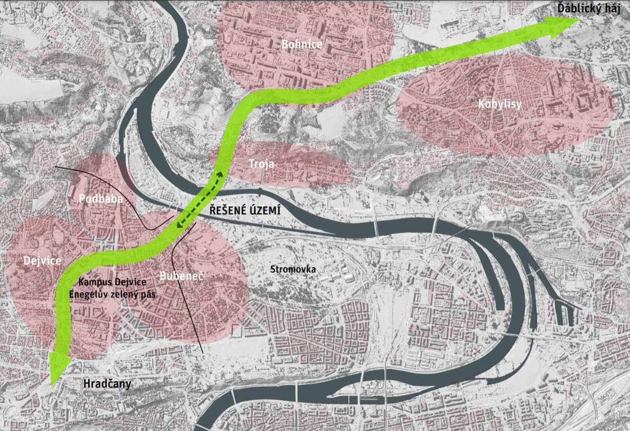 Navržené propojení přes plavební kanál a koryto Vltavy spojuje Bubenečský břeh s Císařským ostrovem a dál s Trojským nábřežím a v širších souvislostech navazuje na zelený pás zamýšlený architektem Antonínem Engelem jako propojení Stromovky a Trojské kotliny přes Dejvice s areálem Pražského hradu.