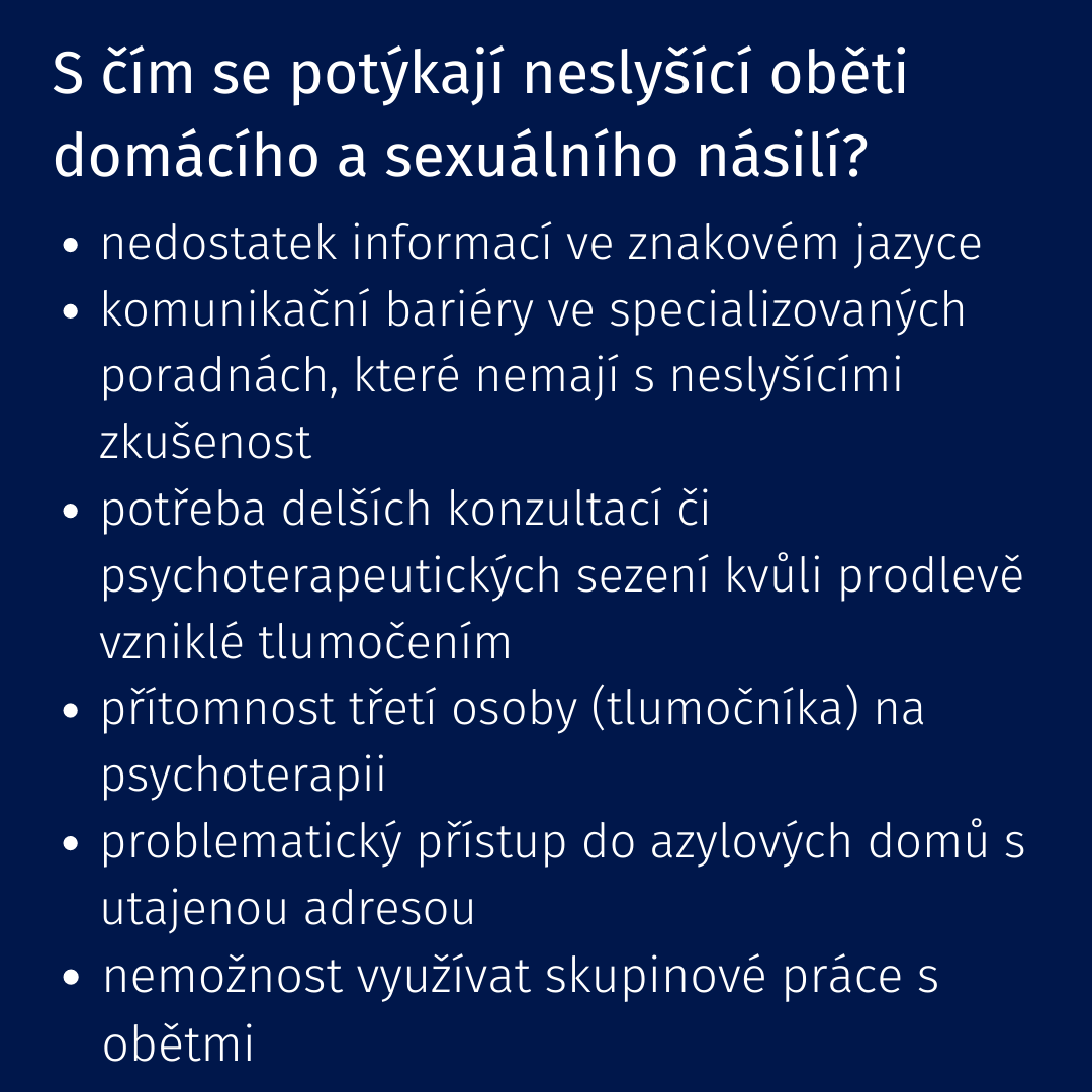 Obě organizace vnímaly, že témata domácího a sexuálního násilí jsou v komunitě neslyšících silně tabuizovaná. Informace o této problematice jsou přístupné a hodně se o nich mluví a píše ve slyšící většině, neslyšícím ale informace v českém znakovém jazyce schází. Netuší pak, jak se se situací vyrovnat, nevědí, kam se mohou obrátit. Často se tak stává, že se jejich problém za zavřenými dveřmi prohlubuje a nikdy nedojde k jeho řešení. Takové případy pak mohou skončit tragicky.