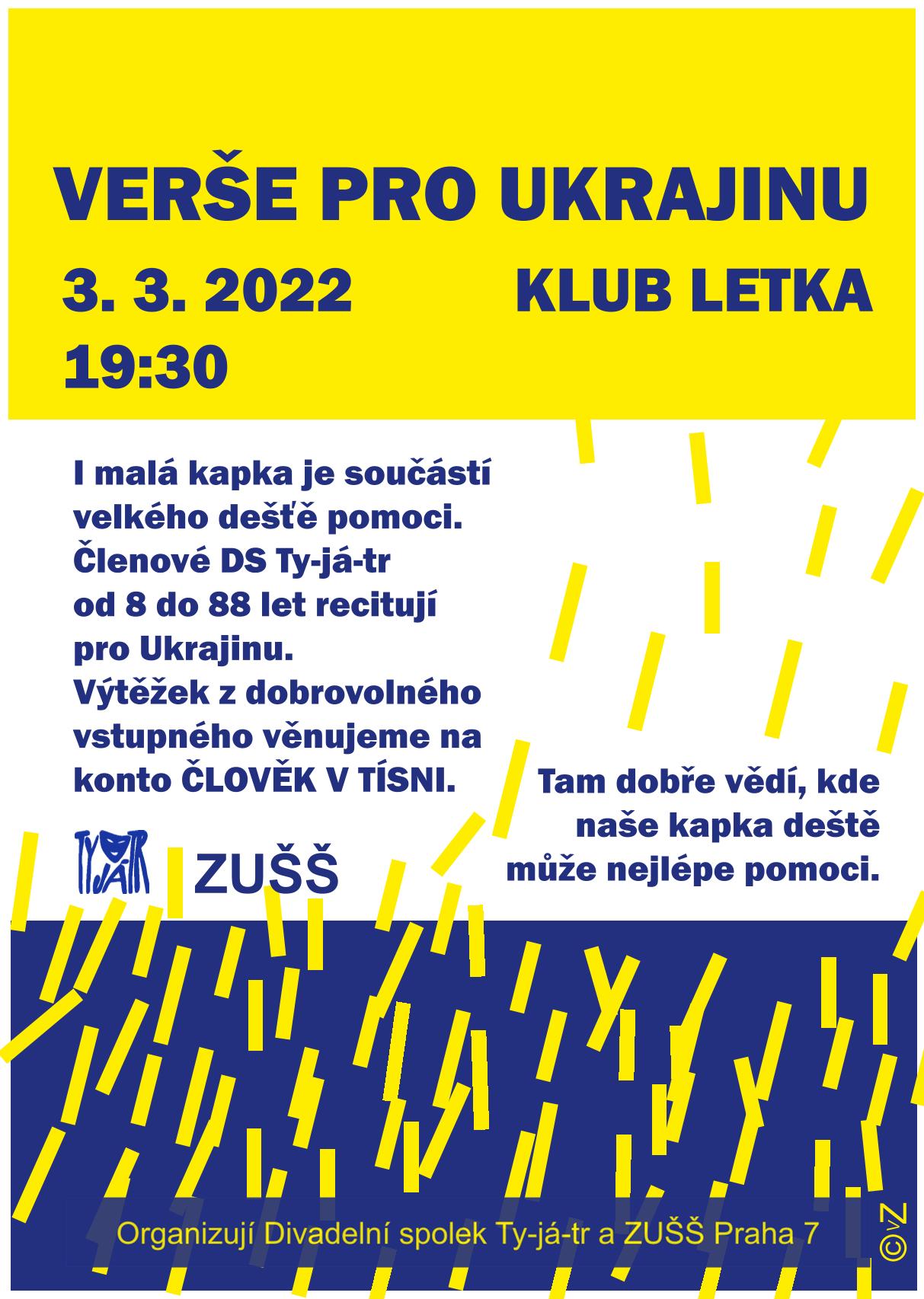 I malá kapka je součástí velkého deště pomoci. Členové DS Ty-já-tr budou ve čtvrtek 3. března 2022 od 19.30 hodin v Klubu Letka recitovat pro Ukrajinu. Výtěžek z dobrovolného vstupného soubor věnuje na konto Člověk v tísni.