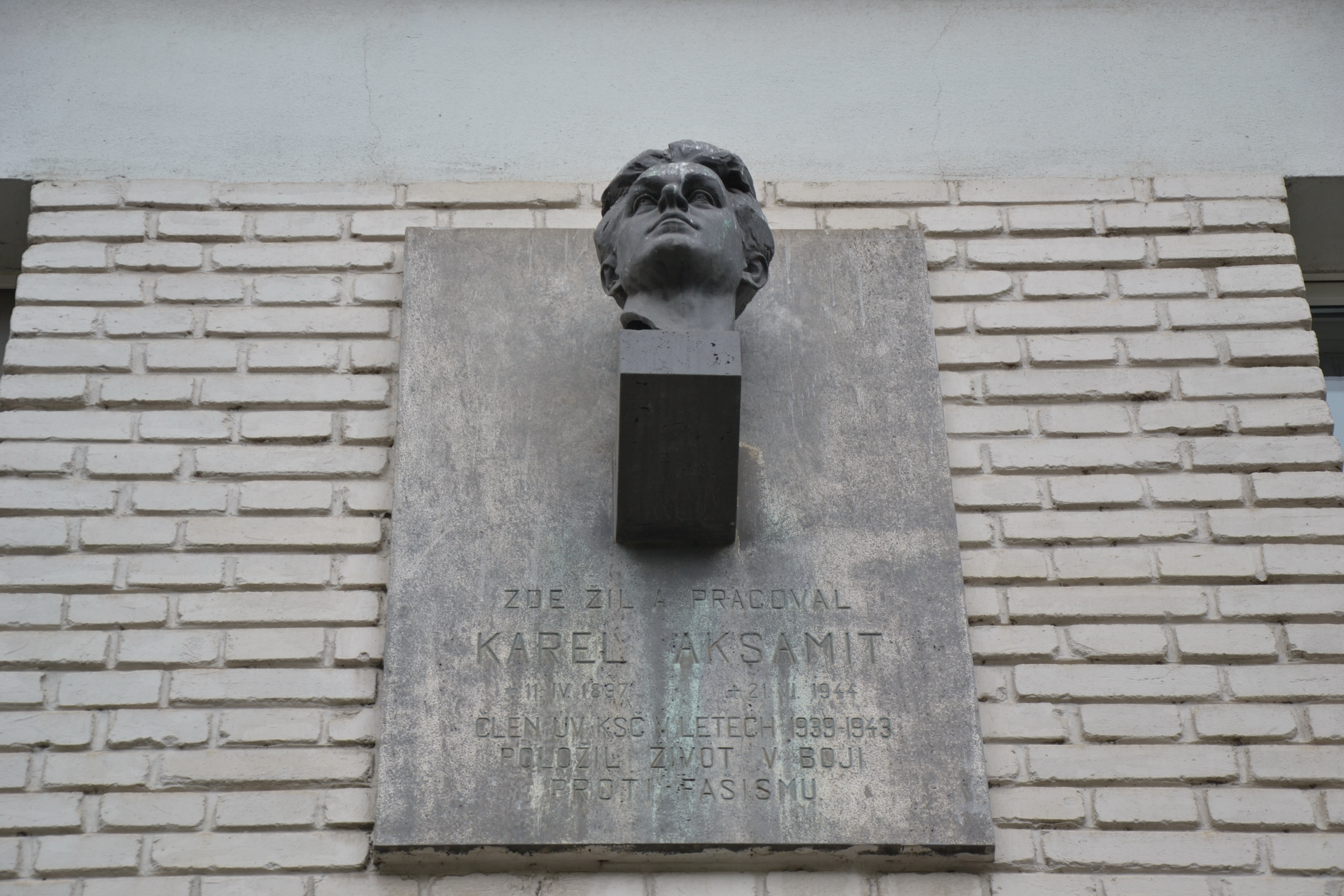 Levicový aktivista Karel Aksamit se narodil v dubnu 1897 v Košťatech u Teplic. Už v útlém mládí pracoval v dělnických profesích a jako horník. Během první světové války bojoval v Rusku, kde prožil říjnovou revoluci. V květnu 1921 vstupuje do komunistické strany, o měsíc později se účastní I. dělnické olympiády na Maninách. V roce 1923 se stává organizačním tajemníkem Komunistického svaze mládeže. Pracuje také v českých i mezinárodních dělnických sportovních organizacích. Ve třicátých letech se Aksamit angažoval v pomoci republikánskému Španělsku. V březnu 1939 je v rámci akce „Gitter“ zatčen německými okupanty, po slibu, že se vzdá politické činnosti je propuštěn. Odchází do ilegality, působí na Plzeňsku, později i v okolí Prahy. V roce 1943 se stává členem III. ilegálního výboru KSČ. V červnu 1944 je odhalen gestapem a před zatčením raději volí dobrovolnou smrt. Pamětní deska a busta Karlu Aksamitovi na domě Komunardů 31/ 1126 byla odhalena 22. června 1958. V tento den byl také po tomto komunistickém odbojáři pojmenován i sportovní stadion v nedaleké ulici U Průhonu (dnes Loko Vltavín).