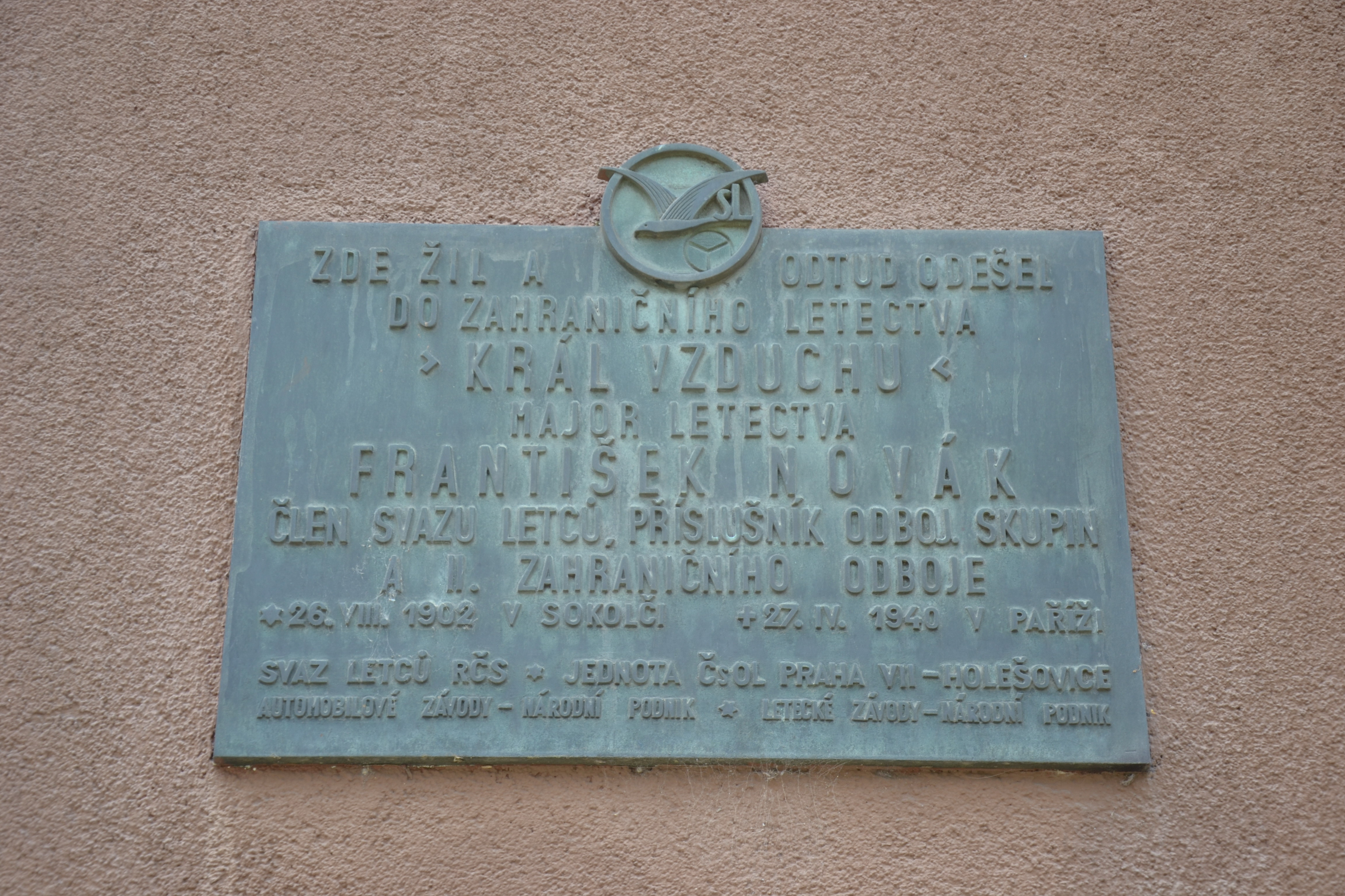 Pamětní deska na domě připomíná letecké eso a „Krále vzduchu“ nadporučíka Františka Nováka, který v domě bydlel před svým odchodem do exilu. František Novák se narodil v roce 1902 v Sokolči u Poděbrad. Ve svých dvaceti letech vstoupil do armády, od roku 1923 sloužil u letectva. Od roku 1925 působil jako instruktor letecké akrobacie při pilotní škole v Chebu. Zároveň reprezentoval Československo na mezinárodních soutěžích v letecké akrobacii. Na neoficiálním mistrovství světa konané v červnu 1934 ve francouzském Vincennes obsadil čtvrté místo. Na podzim téhož roku navštívil a předvedl své umění ve Španělsku a Portugalsku. Zde mu byl udělen čestný pilotní odznak a udělen vysoký řád Cristo. V červenci 1937 vyhrál tři kategorie na závodech ve švýcarském Curychu. Následující rok absolvoval turné po Francii, během kterého předvedl své umění. V druhé polovině třicátých let létal na strojích domácí značky AVIA (na typech A—122 nebo B-422).