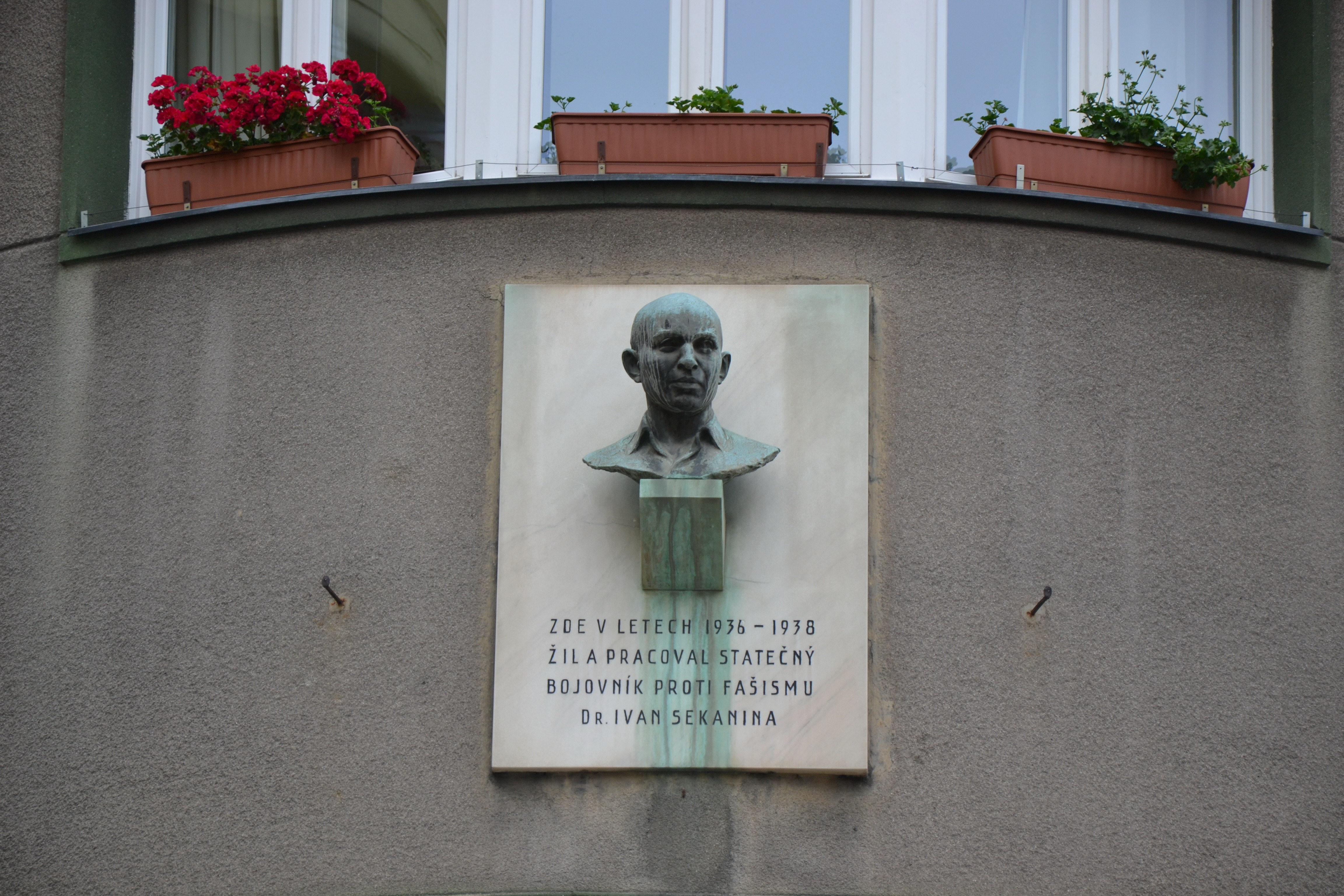 Pamětní deska a busta na domě připomíná, že zde v letech 1936-38 žil levicový intelektuál, právník a publicista Dr. Ivan Sekanina. Narodil se v rodině gymnaziálního profesora. Studoval na gymnáziu v Novém Městě na Moravě, kde se seznámil s Jiřím Wolkerem. Po absolutoriu právnické fakulty vstoupil v roce 1925 do komunistické strany, zároveň se stal obhájcem strany i jejího deníku Rudé právo. Angažoval se ve zmanipulovaném procesu s G. Dimitrovem, který byl obviněn ze žhářského útoku na Říšský sněm v Berlíně. V jednom ze souvisejících procesů chtěl obhajovat bývalého poslance E. Toglera, ale německá justice to nepovolila. Ve třicátých letech se angažoval v celé řadě levicových a antifašistických organizacích – Socialistické akademie, Levé fronty, Výboru na pomoc demokratickému Španělsku nebo Ligy pro lidská práva. V roce 1938 byl jedním z iniciátorů vlastenecké petiční akce „Věrni zůstaneme“. Spolu s filosofem Josefem Fischerem údajně sestavil text petice. Po obsazení zbytků RČS byl hned 16. března 1939 zatčen a transportován do koncentračního tábora Sachsenhausen, kde byl 21. května 1940 umučen. Veřejně aktivní a činná byla i Sekaninova manželka Getruda Sekaninová- Čakrtová. Pracovala v Sekaninově kanceláři, po druhé světové válce byla politicky činná. Po roce 1968 se začala angažovat v disentu, podepsala Chartu 77.