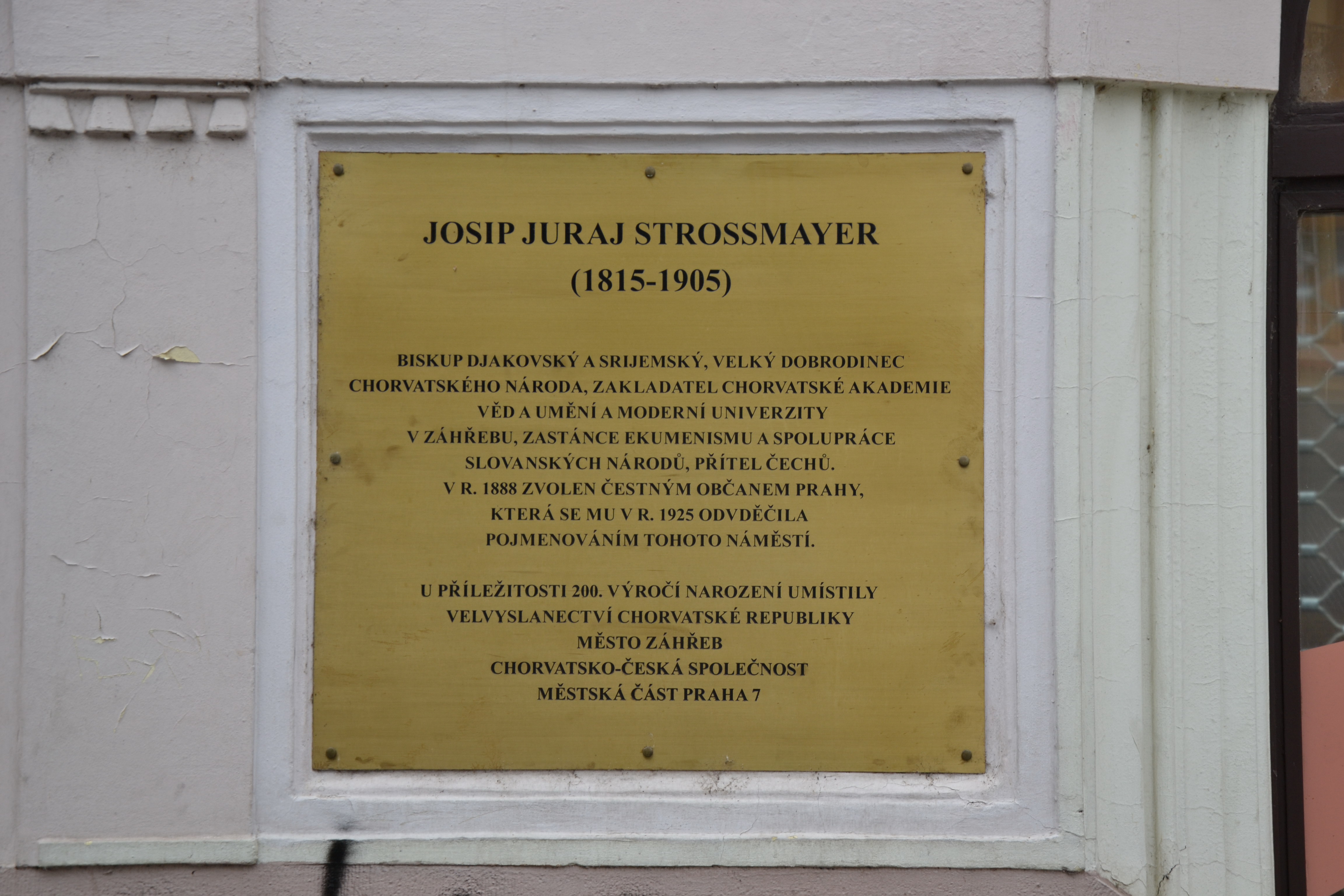 Pamětní deska je věnována Juraji Josipu Strossmayerovi, po kterém je také pojmenováno náměstí, kde se připomínka nachází. Strossmayer se narodil 4. února 1815 v Osijeku v tehdejší Slavonii. Po absolutoriu gymnázia v Dakovu studoval filosofii a později kněžský seminář v Pešti, kde se také seznámil s Janem Kollárem. V roce 1838 byl vysvěcen na kněze, jeho prvním působištěm byl Petrovaradin v dnešním Srbsku. V roce 1840 začal studovat na prestižním vídeňském kněžském semináři Augustineu, kde získal doktorát. Posléze se stal profesorem náboženství a vicerektorem semináře v Djakově. V revolučním roce 1848 podporoval chorvatské národní uvědomění a zájmy proti snahám o maďarizaci slovanských národů v regionu. V roce listopadu 1848 se stal djakovským biskupem, nadále podporoval myšlenku národní i náboženské tolerance. Byl také významným mecenášem – působil v Matici ilirské, podporoval vydávání chorvatských knih, zřizoval nadace umožňující studium talentovaných krajanů. Zásadním způsobem přispěl k zřízení charvátské univerzity v Záhřebu (1874), věnoval celou řadu obrazů ze své sbírky do vznikající galerie v Záhřebu. Strossmayer byl aktivní i v politice, od roku 1860 byl členem říšské rady (rakouský parlament), po roce 1867 vystupoval proti rakousko – uherskému dualismu. Usiloval i o přiblížení katolické církve a moderní společnosti, na vatikánském koncilu v letech 1869 -70 např. vystupoval proti dogmatu o neomylnosti papežské autority. Původně také propagoval také myšlenku konfederace slovanských balkánských národů (včetně Bulharska), ale postupně ji opustil. Jedna z největších postav moderních chorvatských dějin zemřela 8. dubna 1905. Pamětní deska byla odhalena 14. února 2015 za účasti předsedy chorvatského parlamentu Božo Petrova.