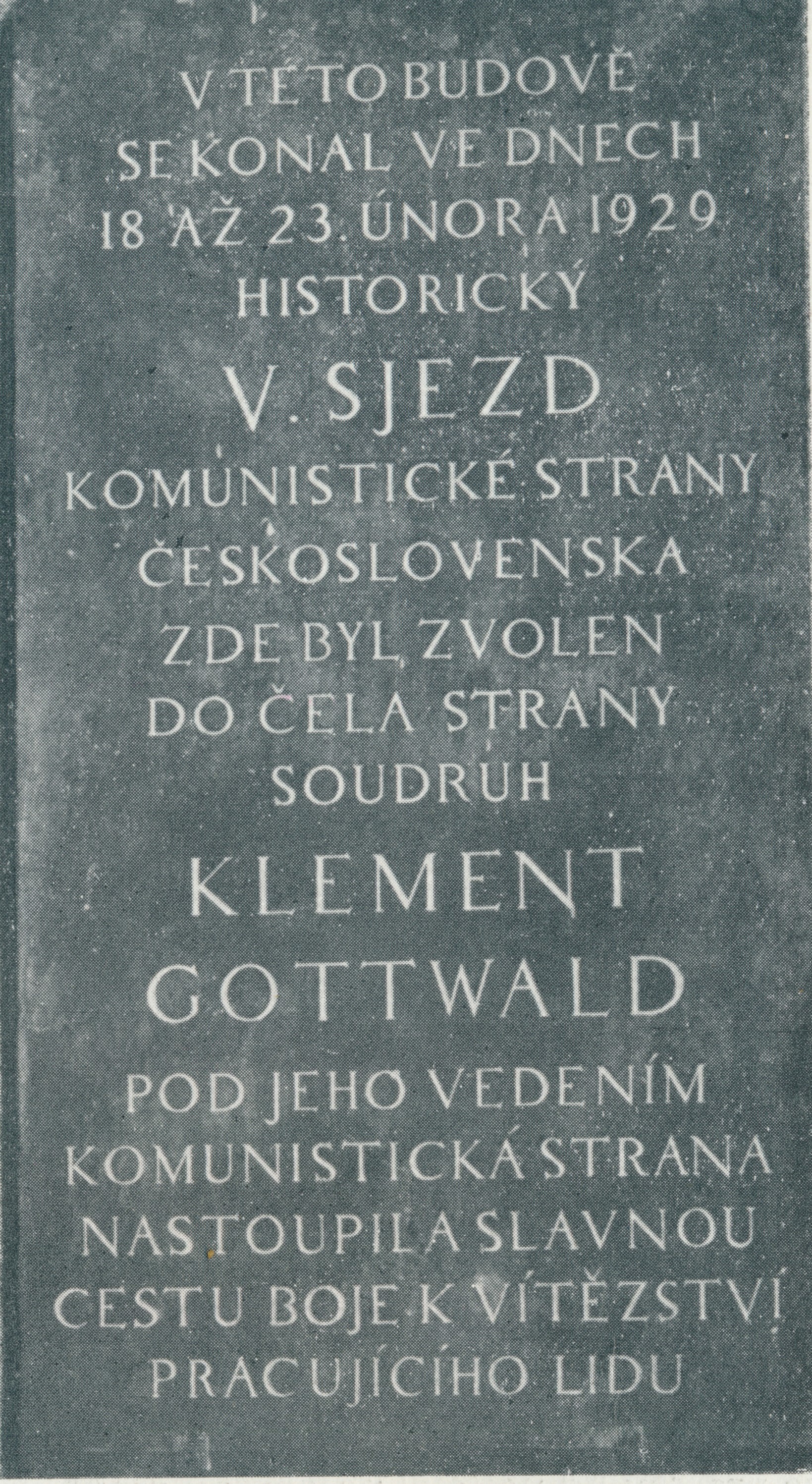 Době svého vzniku poplatnou pamětní desku můžeme spatřit vedle vchodu do KZ Domovina v ulici Na Maninách. Připomíná konání závěrečného jednání V. sjezdu Komunistické strany Československa, který zde proběhl v únoru 1929. Sjezd byl významný především proto, že zde byl do čela strany zvolen Klement Gottwald, který nahradil ve funkci Bohumila Jílka. Ten byl skupinou okolo Gottwalda (označovanou jako „karlínští kluci“) kritizován za svůj údajný oportunismus a nedostatečnou aktivitu. Mocenský pohyb v rámci KSČ souvisel i se změnami v rámci „mateřské“ strany v tehdejším SSSR a bojem mezi Trockým a Stalinem o její vedení. Stranu nakonec ovládnul Stalin, což se odrazilo i Praze, kdy jeho chráněnci ovládli KSČ. To de facto znamenalo konec samostatné politiky českých komunistů. Expředeseda Jílek byl vyloučen ze strany, později se angažoval v agrární straně a po roce 1948 emigroval do USA.