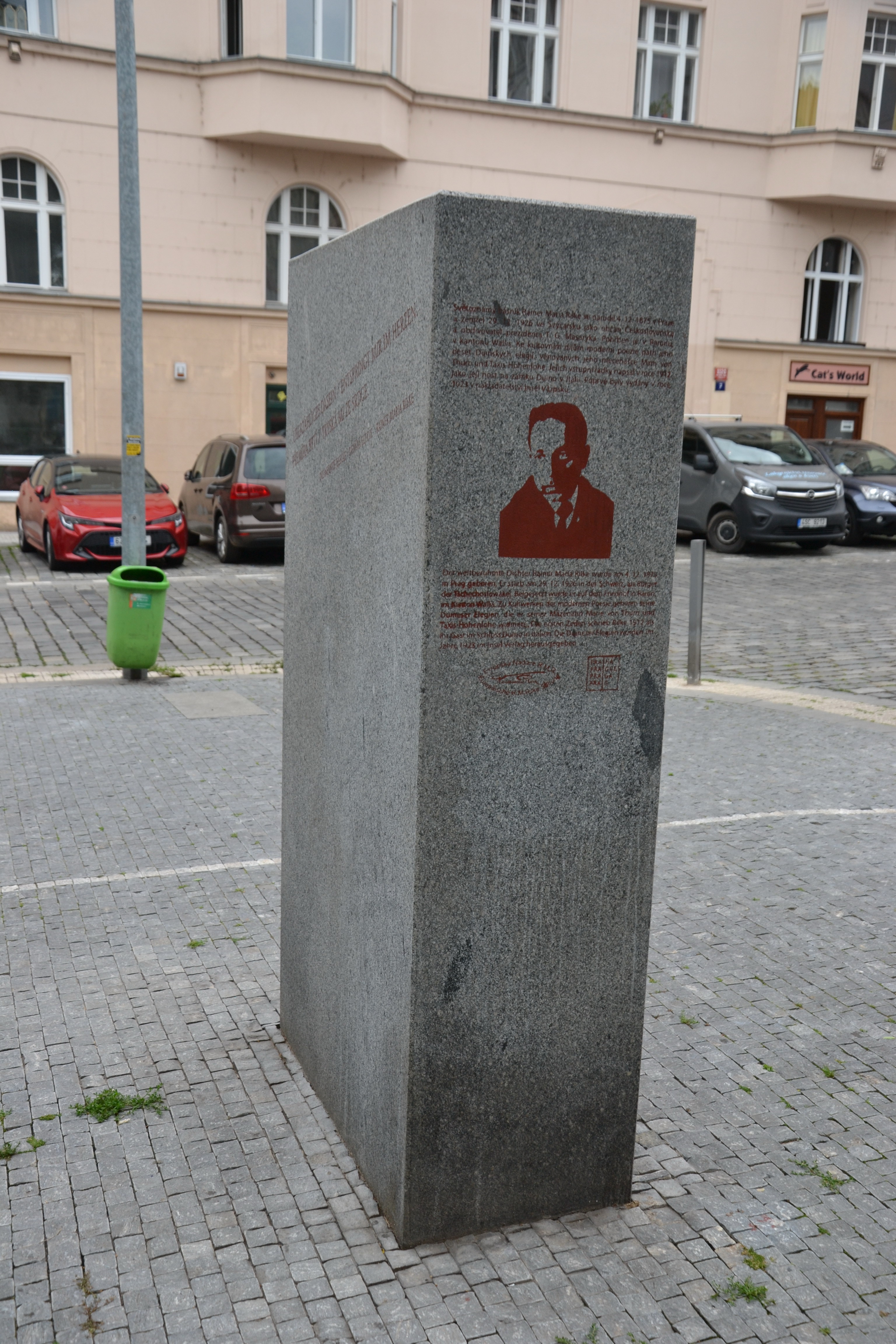 Netradiční pamětní deska se nachází v budově finančních úřadů na nábřeží kpt. Jaroše poblíž Strossmayerova náměstí. Budovu, označovanou někdy jako „pláňák“ (podle Státní plánovací komise, která zde sídlila v období socialismu), nechala vystavět v druhé polovině dvacátých let minulého století Úrazová pojišťovna dělnická. Před druhou světovou válkou zde sídlil i Statistický úřad.