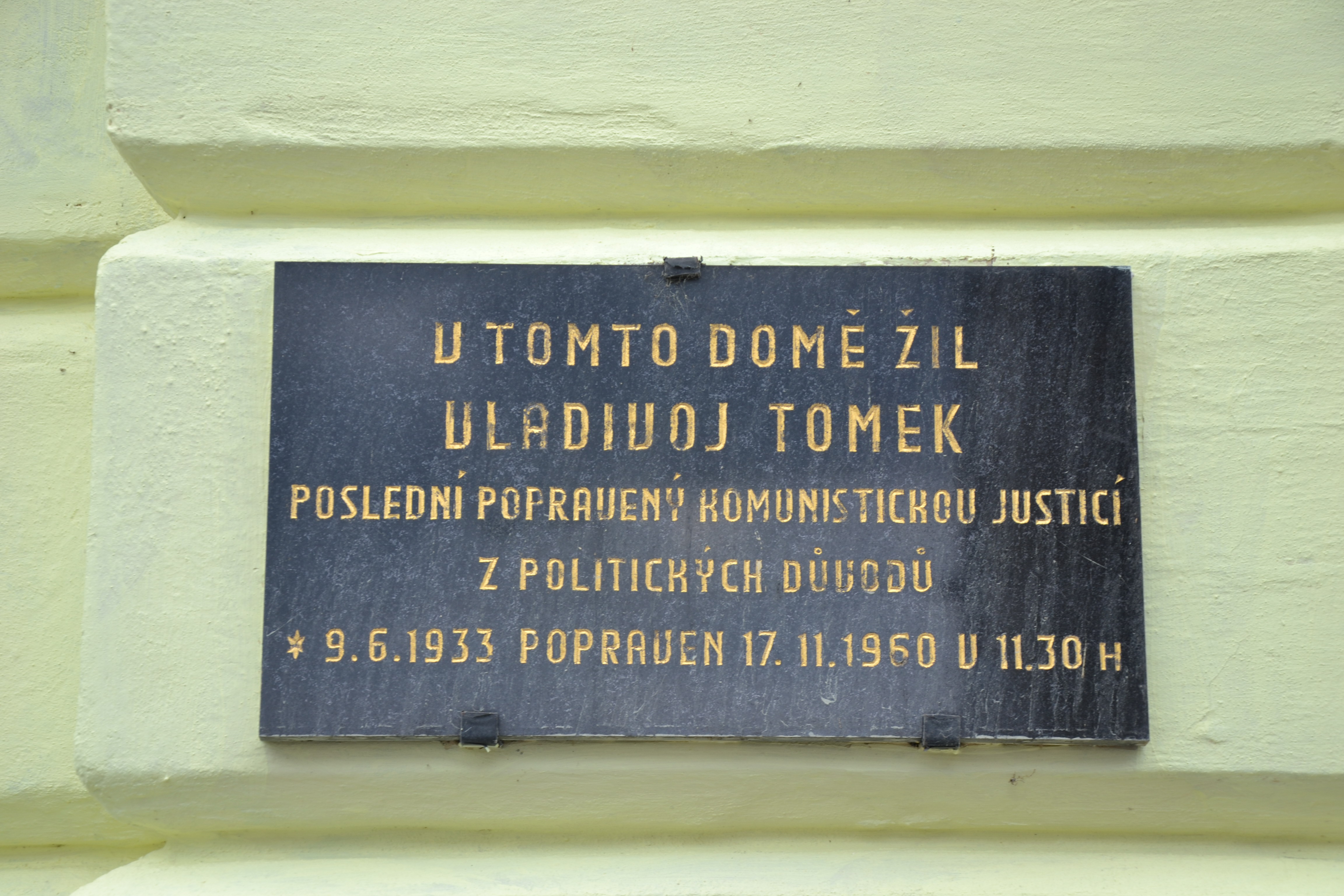 Pamětní deska připomíná památku Vladivoje Tomka (1933-1960), který je považován za posledního popraveného z politických důvodů během komunistického režimu. Skaut Tomek studoval na zdejším La Guardiově gymnáziu (dnes ZŠ Strossmayerovo náměstí), po jeho zrušení přestoupil na francouzské gymnázium v Truhlářské ulici. Už koncem čtyřicátých klet zformoval se spolužáky odbojovou skupinu. Scházeli se v dolní části Letenských sadů a plánovali zde nejrůznější akce proti komunistickému režimu. Jejich záměry se dotýkaly Prahy 7 – měli v úmyslu poškodit železniční trať ve Stromovce či způsobit explozi na zdejším národním výboru nebo v sídle obvodního výboru KSČ. V roce 1952 začali členové skupiny přemýšlet, jak získat zbraně. V polovině prosince 1952 přepadla skupina vedená Tomkem nedaleko židovských hřbitovů na Olšanech čtveřici vojáků základní služby, kteří se vraceli od vysílače ve Strašnicích, který střežili. Po přestřelce zůstává na místě mrtvý vojín Rudolf Šmatava a zraněný desátník Jaroslav Hýbl. Po této akci činnost skupiny ustává, znovu se odbojáři dávají dohromady až na jaře 1956. Opět plánují nejrůznější odbojové akce, které ovšem zůstávají pouze v hlavách členů skupiny. K odhalení Tomka a jeho kolegů nakonec vede až snaha opatřit si na svou činnost více peněz. Právě výtvarně nadaný Vladivoj Tomek se snaží padělat bankovky. Tuto „dílnu“, stejně jako větší množství zbraní a střeliva u něj odhalili příslušníci SNB při domovní prohlídce.