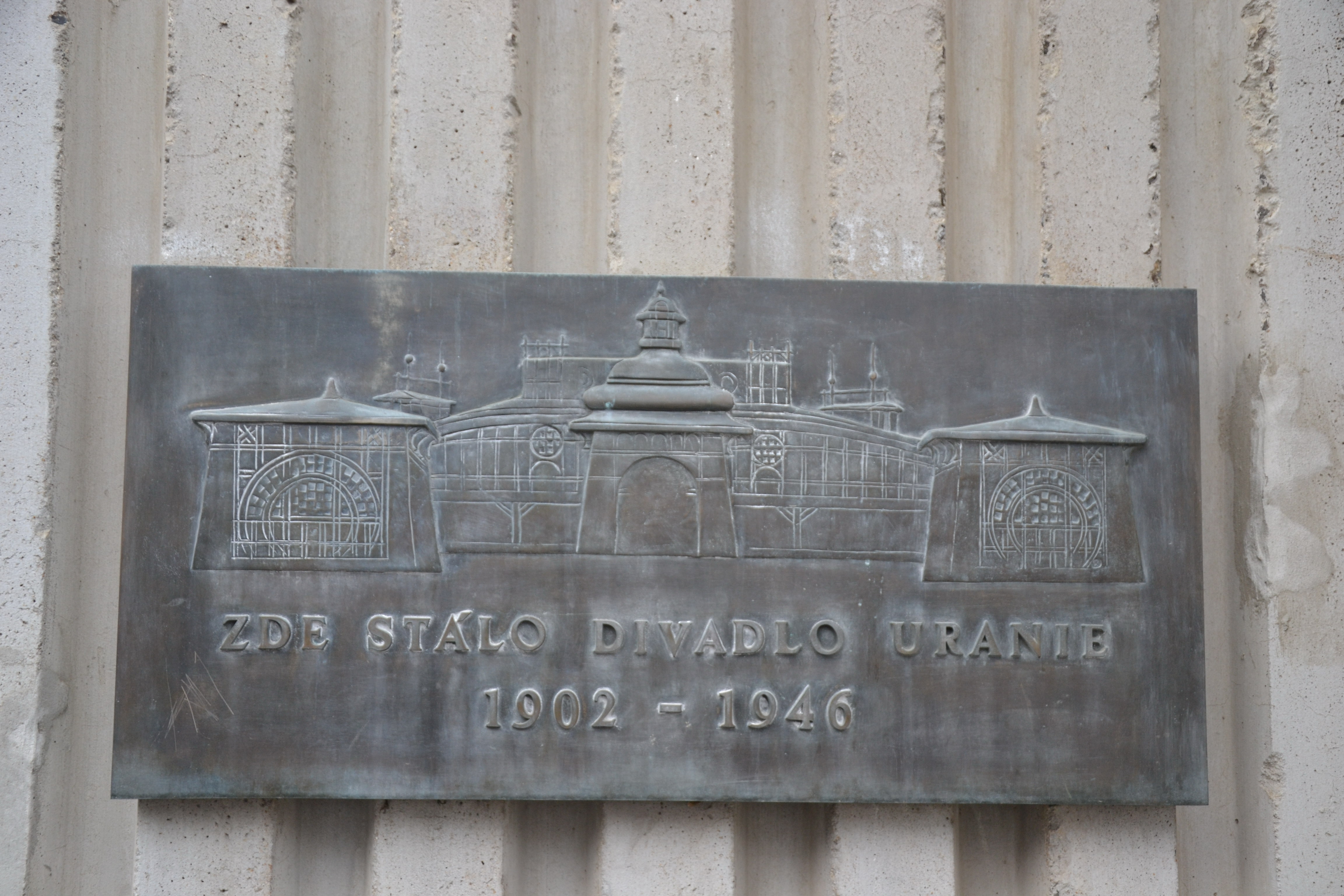 Pamětní deska připomíná, že v těchto místech stávalo populární lidové divadlo Uranie. Dřevěná stavba, kterou navrhl architekt Osvald Polívka, vznikla původně jako zábavní podnik pro Výstavu architektury a inženýrství, která proběhla na nedalekém výstavišti v létě 1898. Prvotním záměrem bylo, i vzhledem k celému konceptu výstavy, že bude budova sloužit především pro pořádání populárně naučných přednášek. Tomuto účelu byl přizpůsoben i tvar jeviště. Představení probíhaly na výstavišti i po skončení výstavy a to až do roku 1902. Tehdy reálně hrozil zánik budovy, tehdejšímu provozovateli a majiteli kočovné herecké společnosti Vilému Sukovi se podařilo přesvědčit ředitele Prvního pražského měšťanského pivovaru Karla Venduláka, aby pro divadlo uvolnil prostor v rozsáhlé zahradě pivovaru v Holešovicích. Divadlo provozovalo družstvo. Před první světovou válkou vedl divadlo například režisér a herec Jakub Seifert. V průběhu doby vystupovaly v Uranii herecké hvězdy – pohostinsky Adina Mandlová nebo Otýlie Beníšková, ve stálém angažmá pak Anna Steimarová nebo Hana Vítová. Jako herec a režisér zde působil také například František Filipovský. Diváci si představení v divadle oblíbili, horší to bylo s divadelní kritikou. Recenzenti často uváděnému repertoáru vytýkali nepůvodnost (uváděny byly překlady cizích her, zejména německých) a bulvárnost. Dnes bychom asi dramaturgii divadla označili za komerční. Konec divadla Uranie přinesl požár v lednu 1946, který založil účetní divadla ve snaze zakrýt vlastní machinace s financemi.