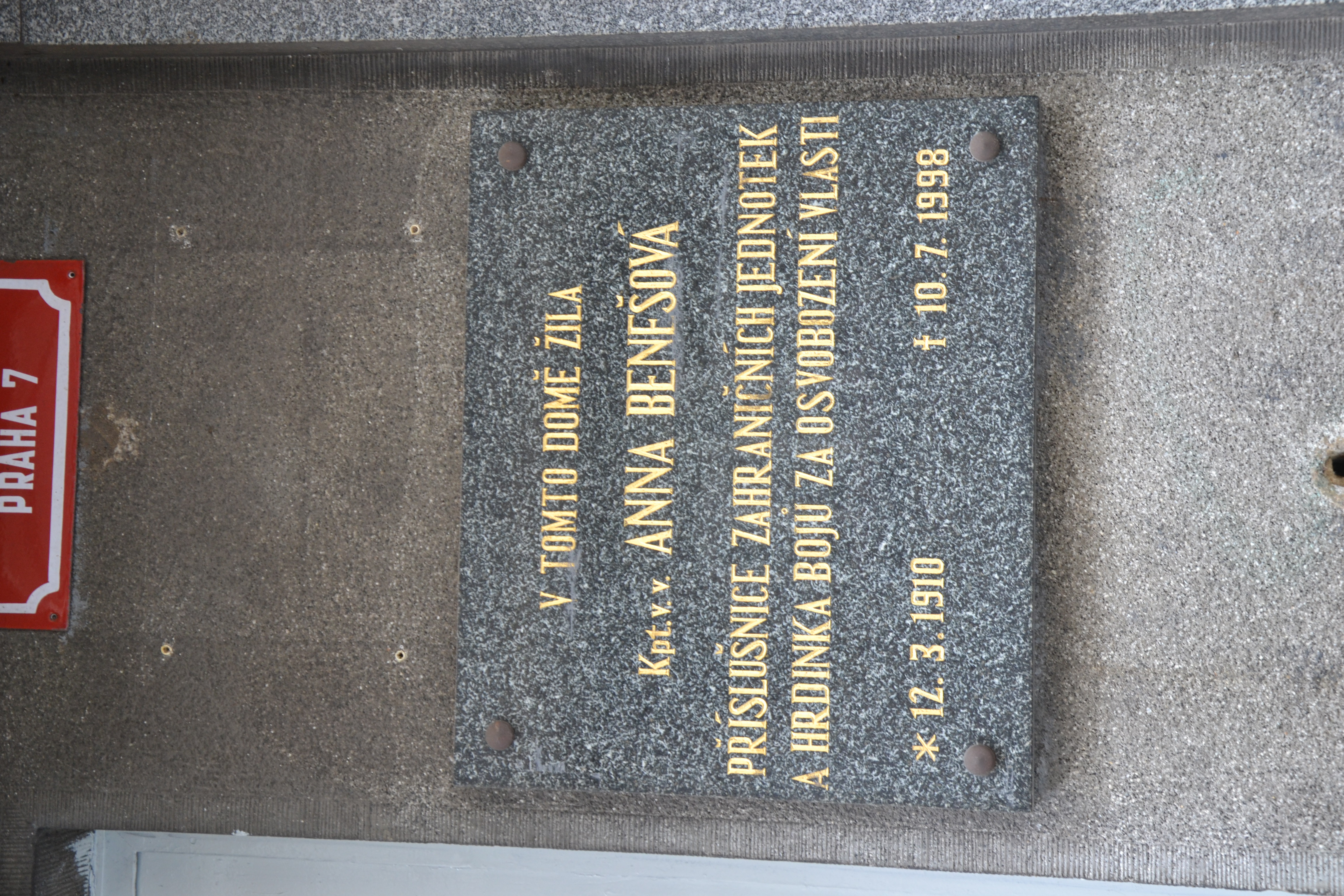 Pamětní deska je věnována kpt. Anně Benešové, veteránce druhé světové války. Benešová se narodila v březnu 1910 v Konecchlumí nedaleko Hořic. Později se přestěhovals se svým manželem Oskarem Benešem do Prahy. Zde je zastihly neblahé události let 1938 a 1939. Manželé odcházejí přes Polsko do SSSR. Usadili se v Kyrgyzstánu, po napadení SSSR Německem se přihlásili do nově zformované československé jednotky. Manžel Oskar působil v jednotce jako minometčík, Anna jako zdravotnice. Účastnili se bojů u Sokolova, Kyjeva (zde byla Benešová těžce raněna), Žaškova nebo Bílé. Benešová posléze změnila bojové zařazení, stala se z ní spojařka, postupně se stala velitelkou radiostanice týlu 1. brigády. V karpatské operaci byla dvakrát zraněna, po vyléčení se účastnila osvobozování Československa. Manžel Oskar operoval na konci války jako člen partyzánské skupiny Národní mstitel v okolí Mělníka, kde také padl. Po válce začala Benešová pracovat na ministerstvu národní obrany, které ze zdravotních důvodů opouští v roce 1947. O tři roky později uzavírá sňatek spolubojovníkem Erichem Juckerem (1912-2005). Jucker byl Benešové spolubojovník z čs. jednotky v SSSR. Bydleli společně v Praze 7, Jucker obdržel nedlouho před svou smrtí titul čestný občan Prahy 7.