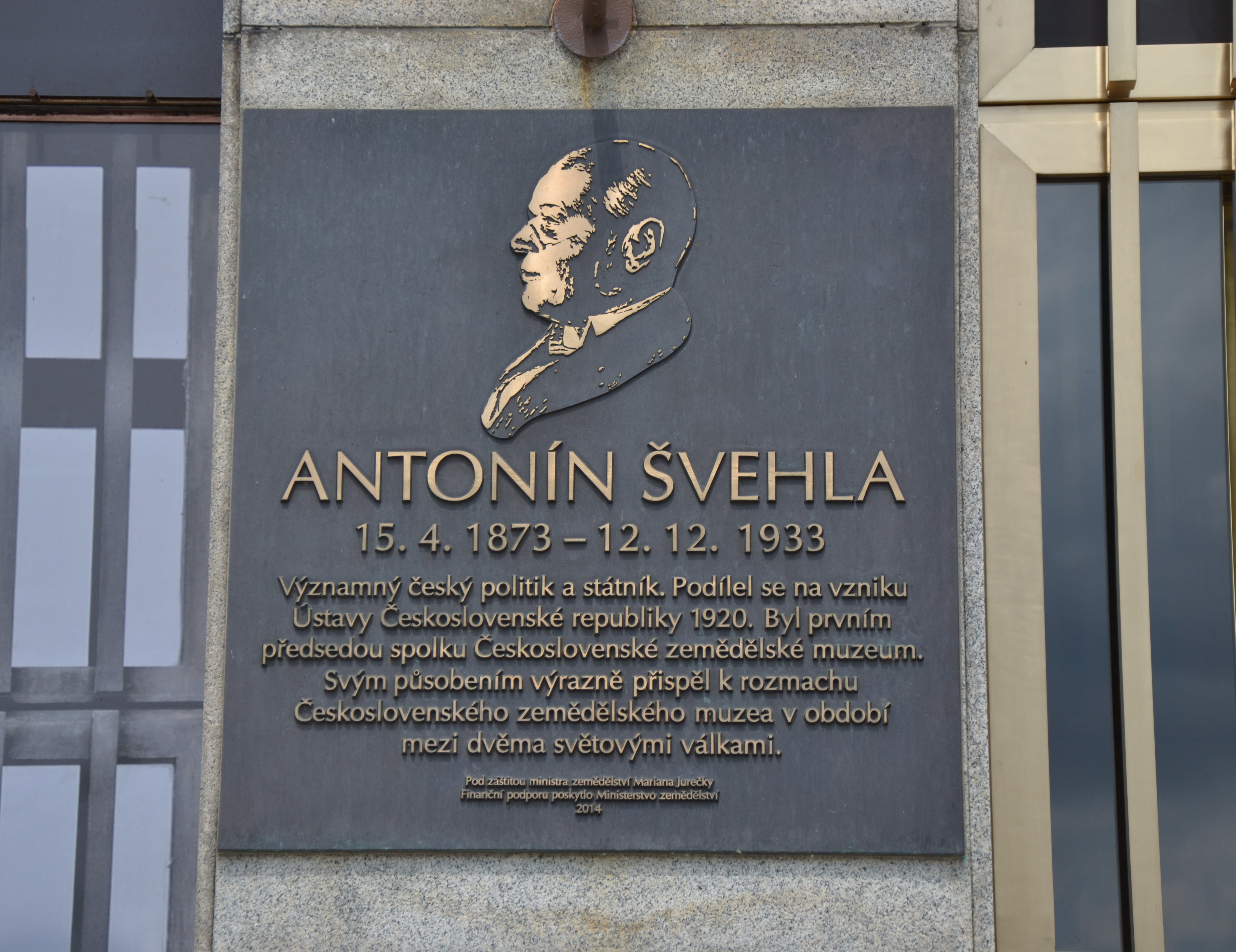 Pamětní deska umístěná na fasádě budovy Národního zemědělského muzea je věnována významnému politikovi první republiky, několikanásobnému ministerskému předsedovi a předsedovi agrární strany Antonínu Švehlovi (1873-1933). Švehla se původně vyučil pekařem, ale předurčen byl především k správě rodinného statku v Hostivaři. Politicky se začal angažovat v devadesátých letech 19. století. V roce 1906 spoluzakládal časopis Venkov, v letech 1908-1913 působil jako poslanec zemského sněmu. Byl jedním z mužů 28. října. Švehla se také podílel na vzniku a fungování tzv. pětky, tedy neformálního sdružení předsedů pěti nejvýznamnějších politických stran. V roce 1929 se kvůli nemoc stáhnu z politického života.