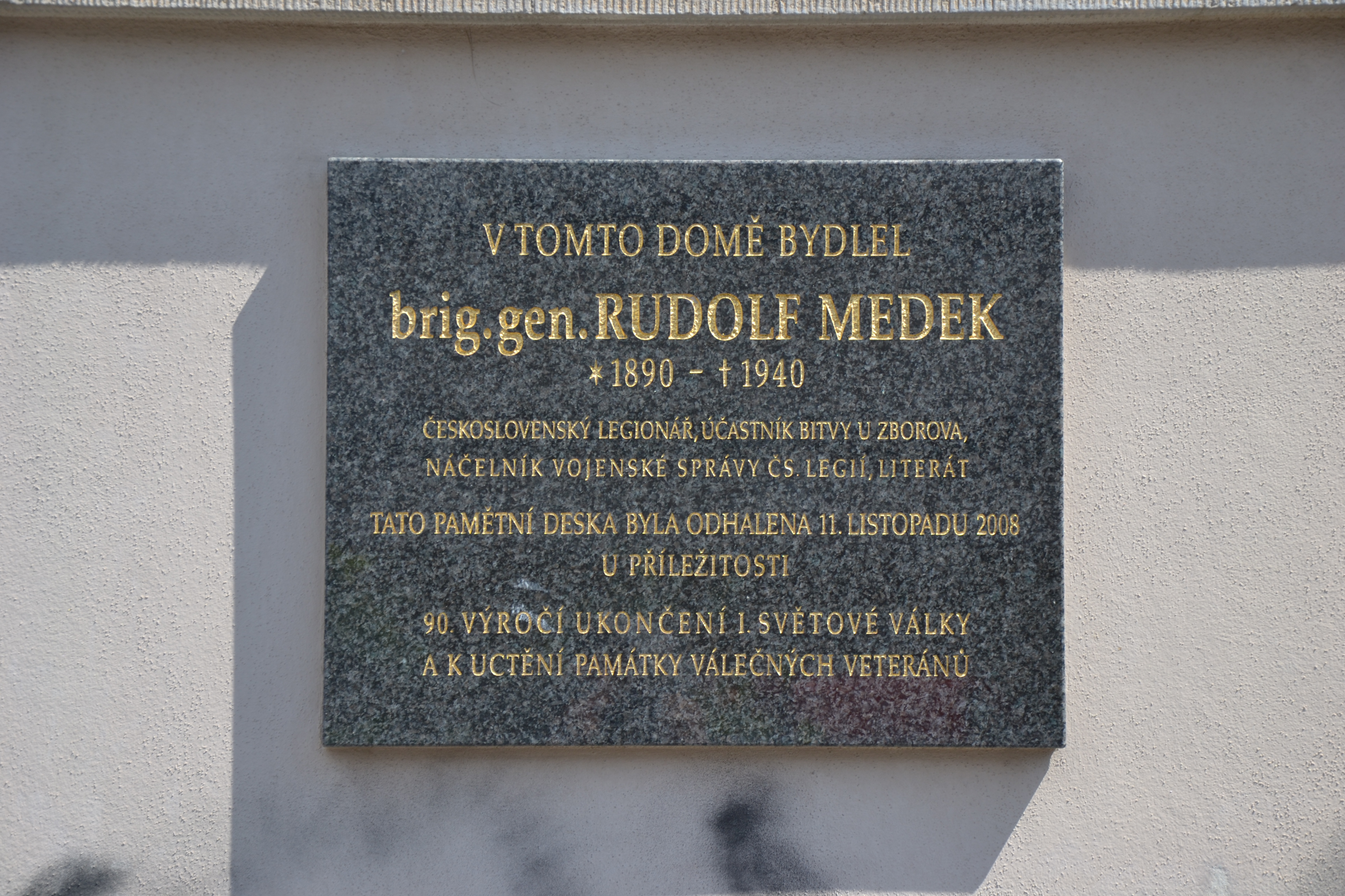 Pamětní deska brigádního generála Rudolfa Medka je umístěna na domě, kde důstojník a spisovatel žil se svou rodinou. Královehradecký rodák Medek absolvoval učitelský ústav a před první světovou válkou působil jako pedagog. Po vypuknutí první světové války byl povolán do rakouské armády, kde prošel důstojnickým kursem. Byl nasazen na ruské frontě, koncem roku 1915 přešel právě k Rusům a posléze se připojil k československým legiím. Zúčastnil se bojů u Zborova, v rámci hierarchie legií rychle stoupal. Ke konci roku 1919 už jako příslušník nově vzniklé československé armády dosáhl hodnosti podplukovníka, v roce 1931 byl povýšen do hodnosti brigádního generála.