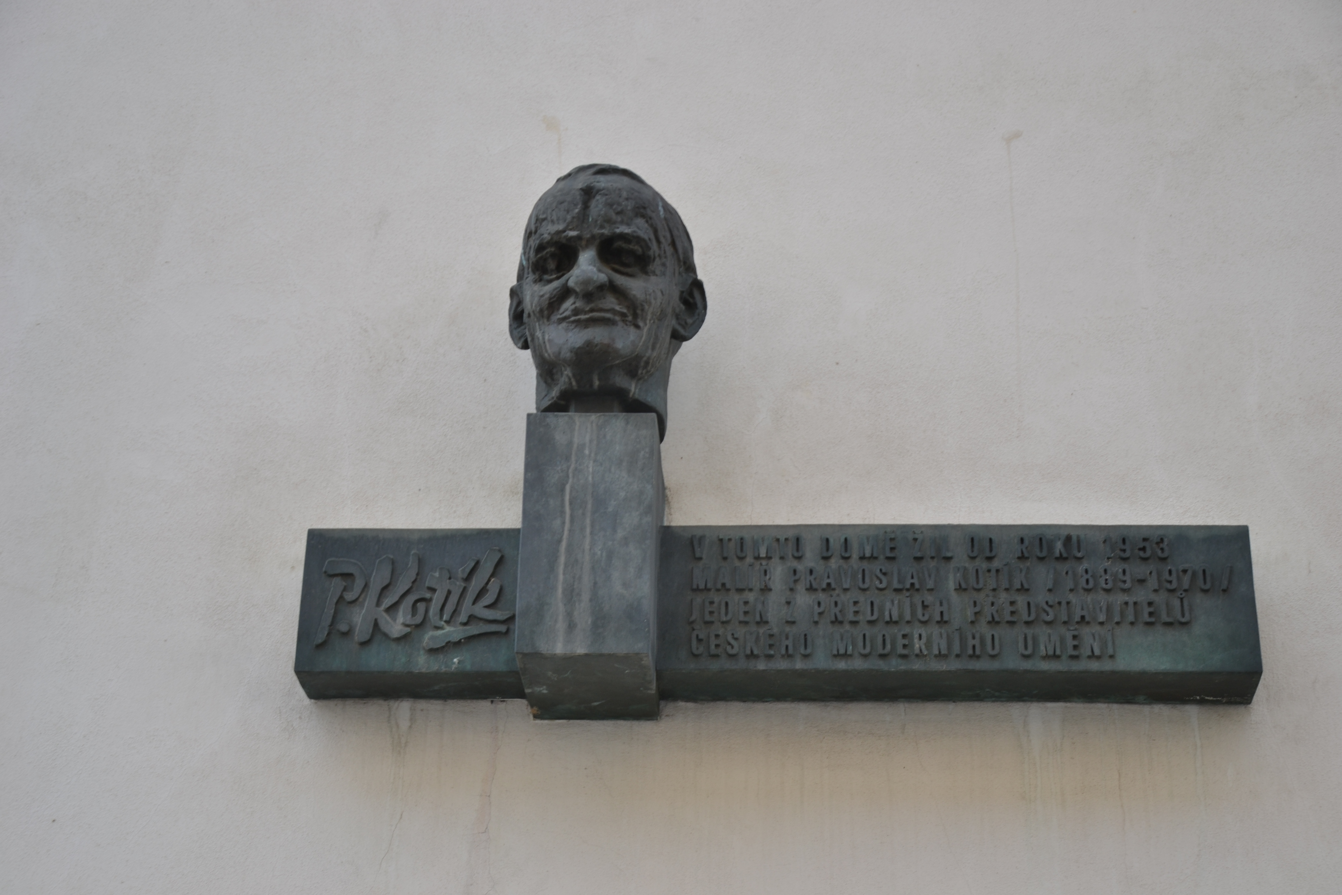 Zajímavá pamětní deska spojená s bustou připomíná pobyt významného českého malíře Pravoslava Kotíka v tomto domě. Rakovnický rodák Kotík studoval před první světovou válkou Vysokou školu uměleckoprůmyslovou, mimo jiné v ateliéru Jakuba Schickanedera. V letech 1913-1939 působil jako středoškolský pedagog – v Turnově, Nové Pace, Mladé Boleslavi a v Praze. Ve dvacátých letech byla jeho tvorba ovlivněna kubismem, věnoval se sociálním tématům. Kromě malby a grafiky se také věnoval tvorbě gobelínů nebo vitráží. Během druhé světové války se Kotík ocitl v nemilosti, stejná situace se opakovala v prvních letech komunistického režimu. Umělecky rehabilitován byl až v šedesátých letech minulého století. Pamětní deska na domě, kde Kotík od roku 1953 až do své smrti v roce 1970, vytvořil sochař Michal Vitanovský a byla odhalena v roce 1989.