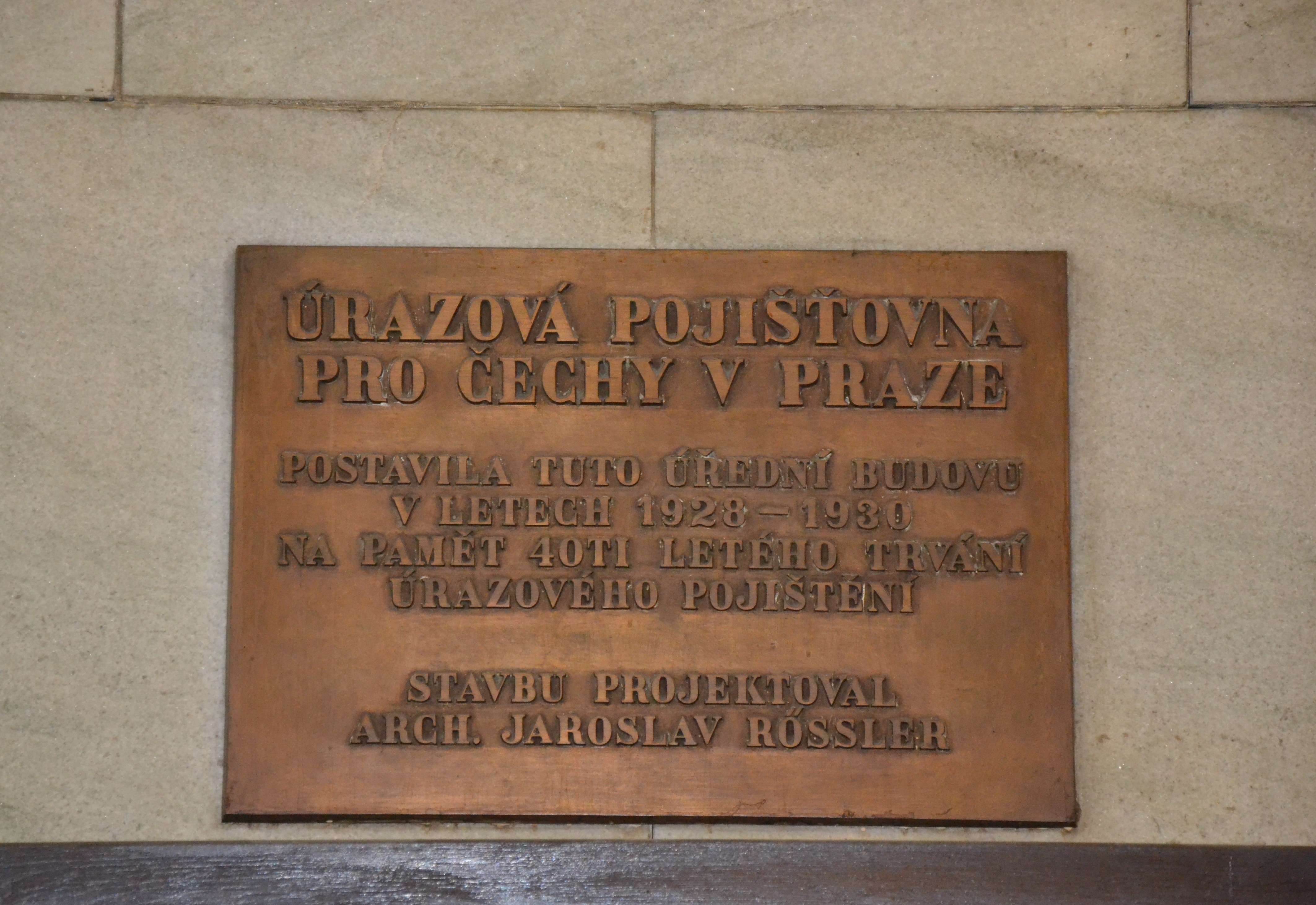 Na pamětní desce stojí, že budova byla vybudována na paměť 40 let trvání dělnického pojištění. Hmotné zajištění dělníků v případě úrazu nebo nemoci bylo významným krokem v rámci posilování práv toho stavu. První zákon v rámci rakouské monarchie byl přijat v listopadu 1889, o pět let později prošel významnou novelizací. Úrazové pojištění bylo povinné, do pokladny pojišťovny přispíval zaměstnavatel 90% částky, zbytek se strhával ze mzdy dělníkům.
