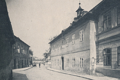 Palackého ulice ve starých Holešovicích, budova vpravo (s věžičkou) sloužila jako škola
